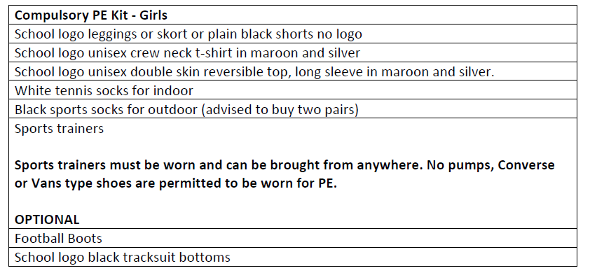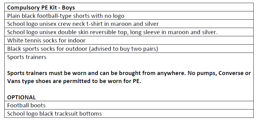 The supplier for our PE kit is also Totally Uniform. Kit will be available to purchase either in store or via their online ordering service for either click and collect or delivery from July/August, ready for the start of the new academic year in September 2025.